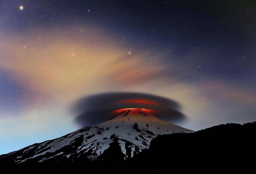 降暂时夜幕e》发布年度最佳科学图片,照亮了两朵圆润完好的环状云智利比亚里卡火山喷涌的熔岩。roni按期赶赴这座火山监测其运动影相师Francisco Neg,这一景色缉捕到了。