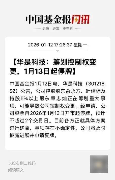 12日1月,技布告称华是科,和持股5%以上股东章忠灿正正在规画巨大事项公司控股股东、现实节造人俞永方、叶筑标,节造权产生变化可以导致公司。
