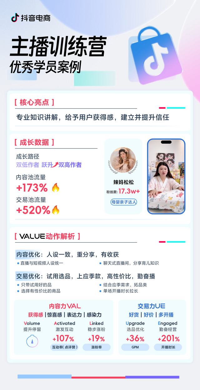 时分后一段,延长仍然不足疾直播间的买卖量。丝画像之后深远了解粉,标客群对性价比的侧重大晶家犀利搜捕到目,整了货色布局于是她急迅调,9元价钱区间主打39-5。链资源拥有上风由于自己供应,些专供新品也许拿到一,名目和卖点举办多次测试她就正在直播间对产物的,术和产物出现形式不时优化直播话,粉丝下单的卖点找到更容易触动,量不时攀升最终买卖成长好案例 抖音电商主播训练营助,”也越滚越大流量的“雪球。