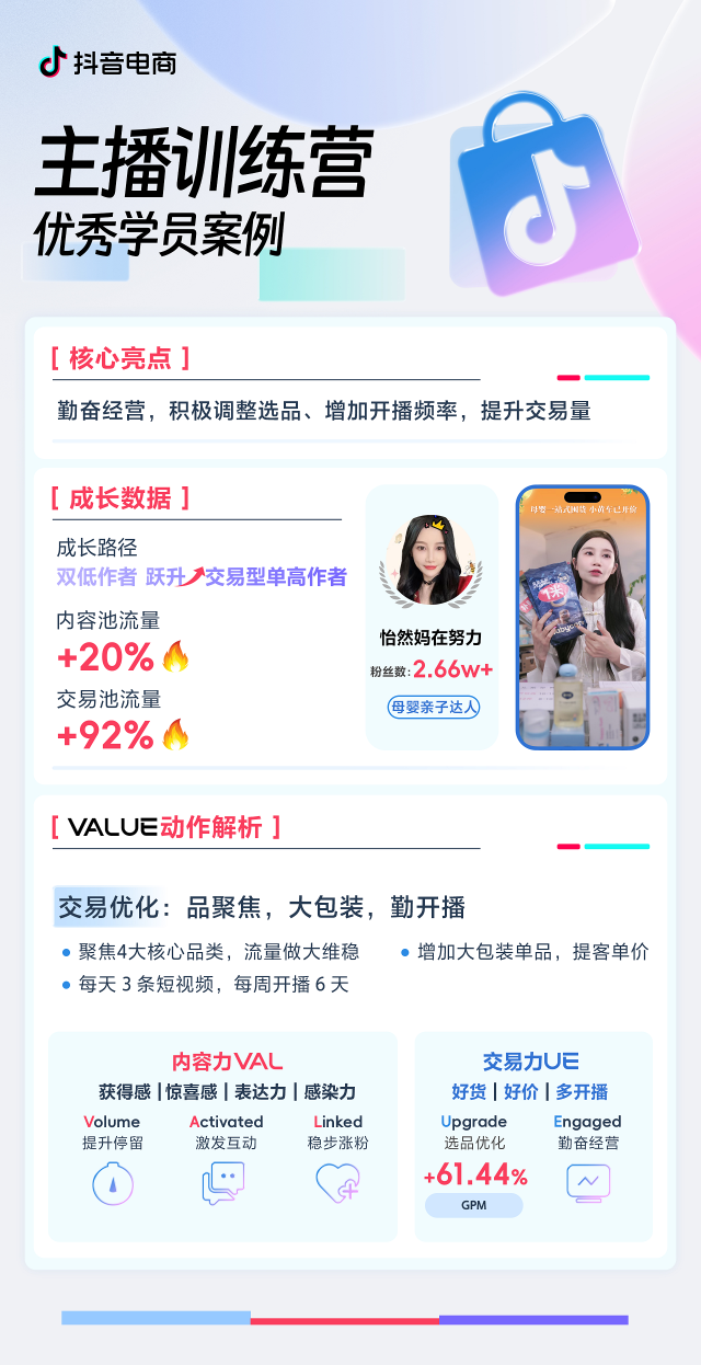 杰出作家案破例除了上面分享的,通过VALUE作家策划门径论再有更多区别类型的作家正正在,买卖力的打破告终实质力和。下来接,教练营”将正在更多都邑落地抖音电商“潜力作家主播,握流量机造新时机帮帮更多作家把,易力的双重跃迁告终实质力+交。