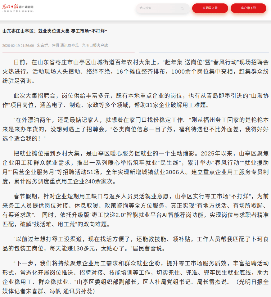 2月19日2026年,就业岗亭进大集 零工商场“不打烊”光昭质报客户端报道山东枣庄山亭区:。